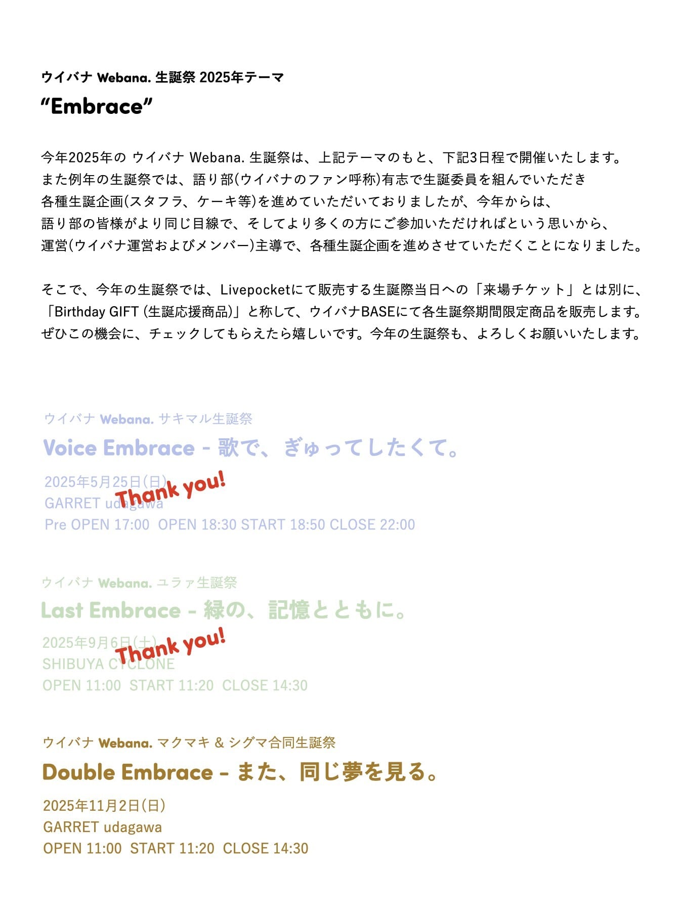 そこで、今年の生誕祭では、Livepocketにて販売する各生誕際当日への「来場チケット」とは別に、「Birthday GIFT (生誕応援商品)」と称して、当ウイバナBASEにて、各生誕祭期間限定商品を販売します。ぜひこの機会に、下記チェックしてもらえたら嬉しいです。今年の生誕祭も、よろしくお願いいたします。