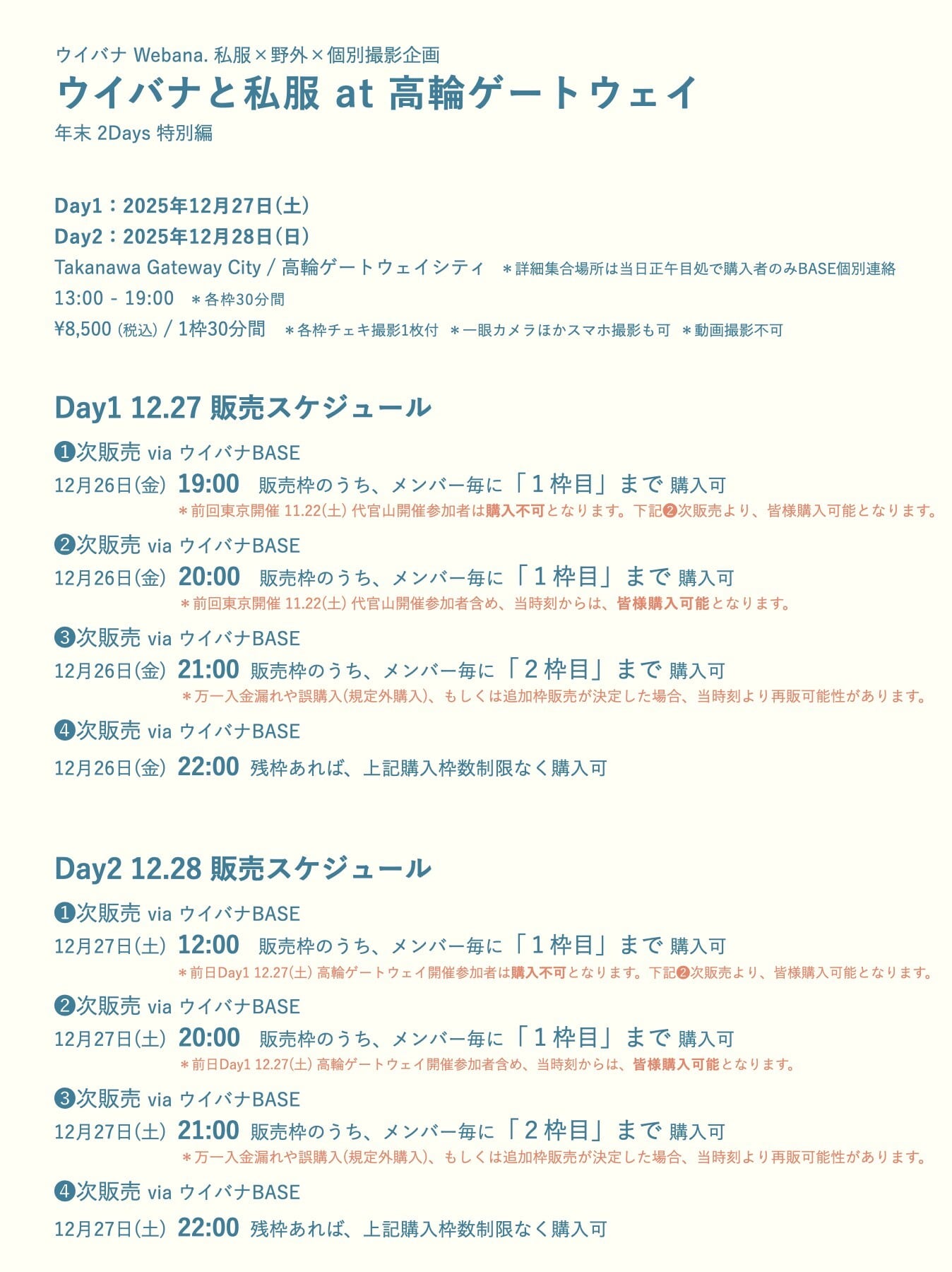 *メンバーと1対1の個別撮影企画となります。各枠時間30分の中で、集合場所にお戻りください。